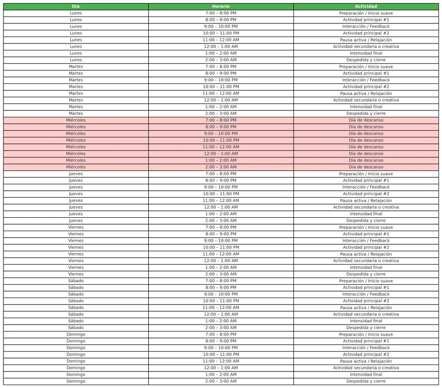 Este horario está diseñado para mantener un flujo equilibrado de energía y creatividad cada noche, con actividades distribuidas entre interacción, momentos de intensidad y pausas activas 🥰. Los miércoles son días de descanso para recargar energías y volver con más fuerza el resto de la semana 🥰👾